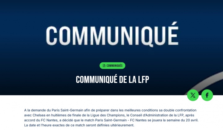 为欧冠踢切尔西让路!官方:3月16日巴黎对阵南特的法甲比赛延期