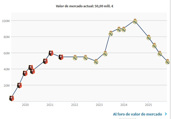 2024年7月,卡马文加的身价曾达到巅峰的1亿欧,但自此之后连续4次下跌,现如今仅为巅峰的一半。