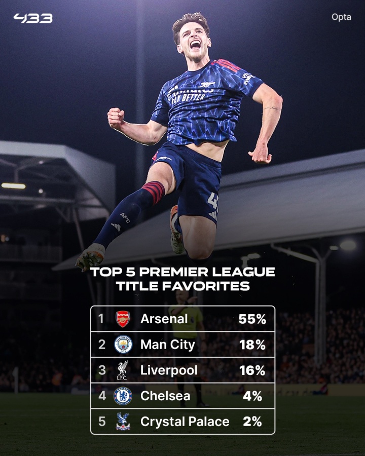 据OPTA推算,阿森纳英超夺冠概率55%,欧冠夺冠概率20%,均是最高。