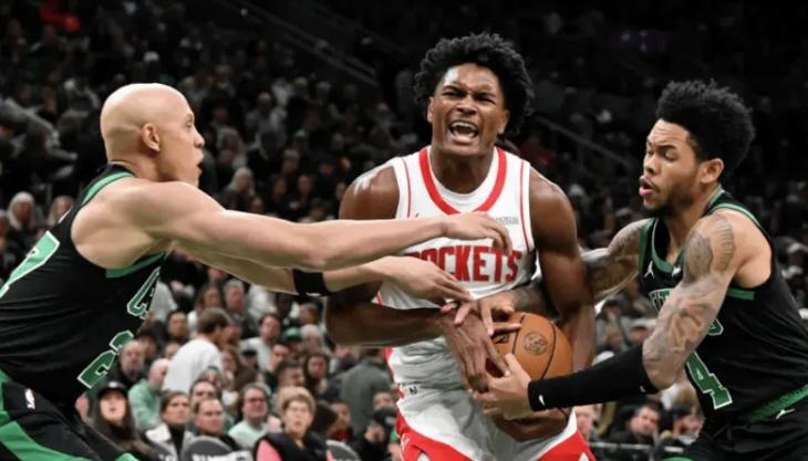 NBA常规赛,火箭128-101战胜凯尔特人,赛后,凯文-杜兰特接受媒体采访,他表示对阿门-汤普森能够平衡防守职责和组织进攻的能力印象深刻。