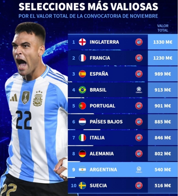 德国转会市场统计了11月国际比赛日各国家队的身价,并列出榜单,英格兰、法国、西班牙前三,阿根廷排在第九位。