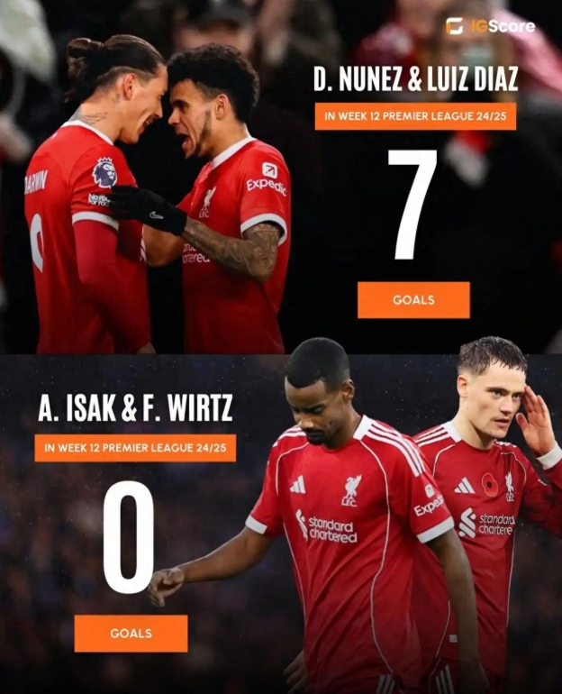 今年夏窗利物浦花费1.45亿欧元+1.25亿欧元签下两大新援伊萨克和维尔茨,但12轮英超过后,两人颗粒未收,只有伊萨克在联赛杯中打进一球。