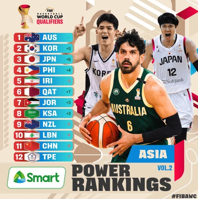 世预赛亚洲区实力榜:澳韩日分列前三,中国男篮跌至第11