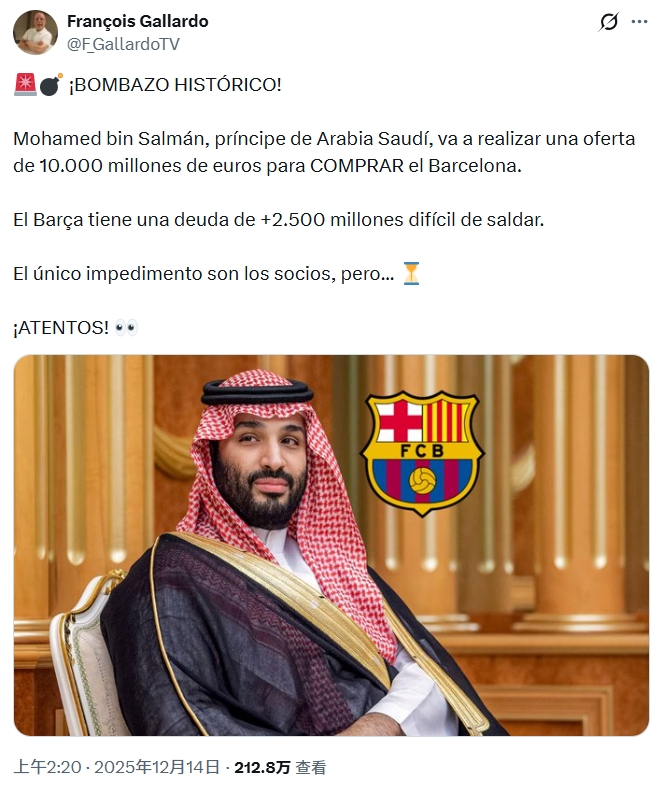 12月15日讯 西班牙记者François Gallardo再爆猛料,称沙特王储有意以100亿欧元收购巴萨。