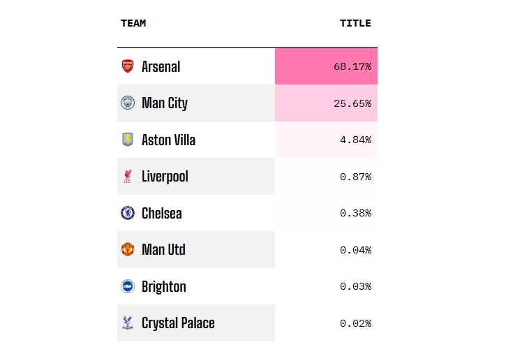 英超最新夺冠概率:阿森纳68.17%,曼城25.65%