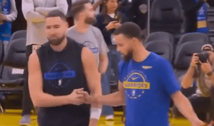 赛后勇士球员斯蒂芬-库里接受了记者采访,在谈到本场赛前热身阶段克莱-汤普森主动走向自己握手的团聚时刻时说: