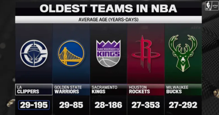 联盟平均年龄最老球队:快船、勇士、国王、火箭、雄鹿