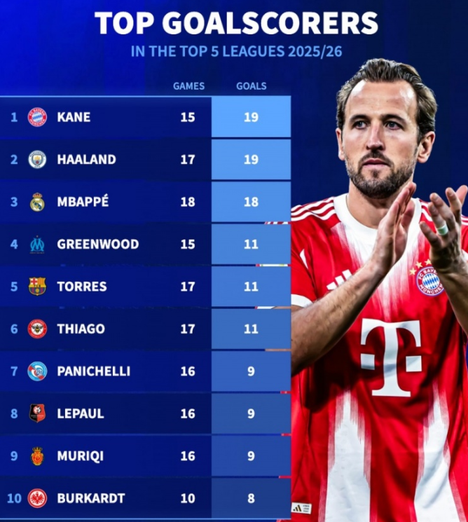 德国转会市场列出了本赛季五大联赛射手榜,凯恩、哈兰德19球居首。
