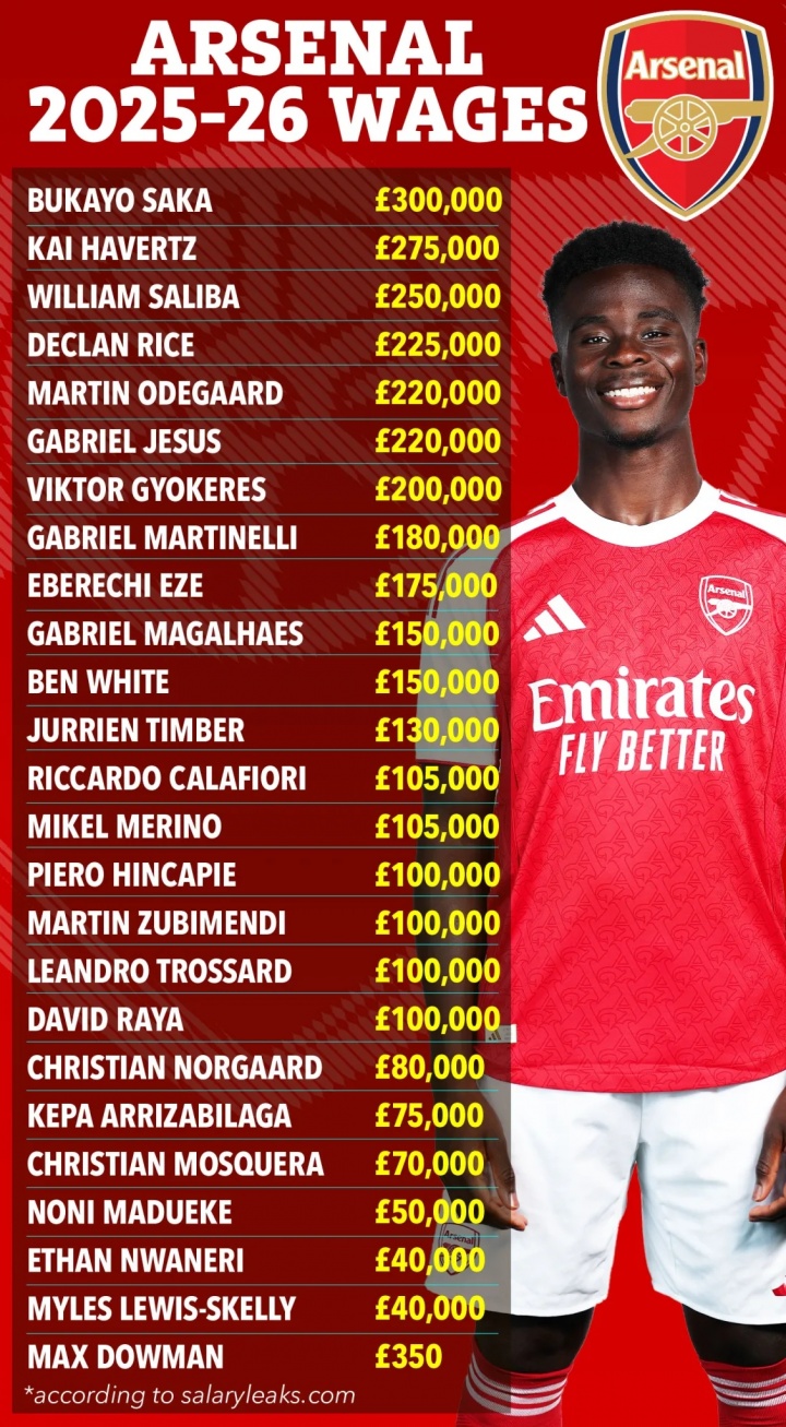 多方报道称阿森纳与萨卡敲定新合约,他将在阿森纳拿到30万镑的队内顶薪,《太阳报》罗列了阿森纳队内的最新周薪排名。