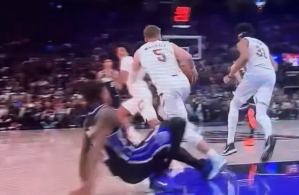 比赛中,骑士球员梅里尔拿下篮板准备推快攻时,倒在地上的德罗赞使用了足球中的“铲球动作”。