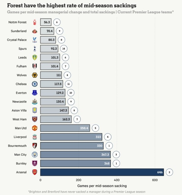 TA:森林赛季中期换帅最频繁 阿森纳最不频繁 热刺次数最多