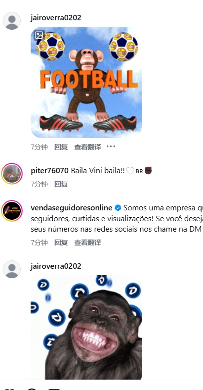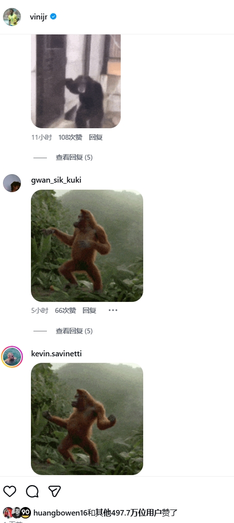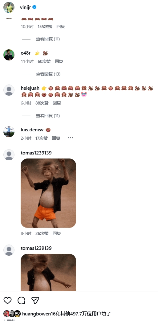 维尼修斯对本菲卡社媒评论约22万条,被球迷发猩猩猴子表情包攻占
