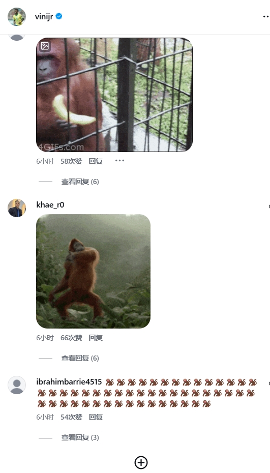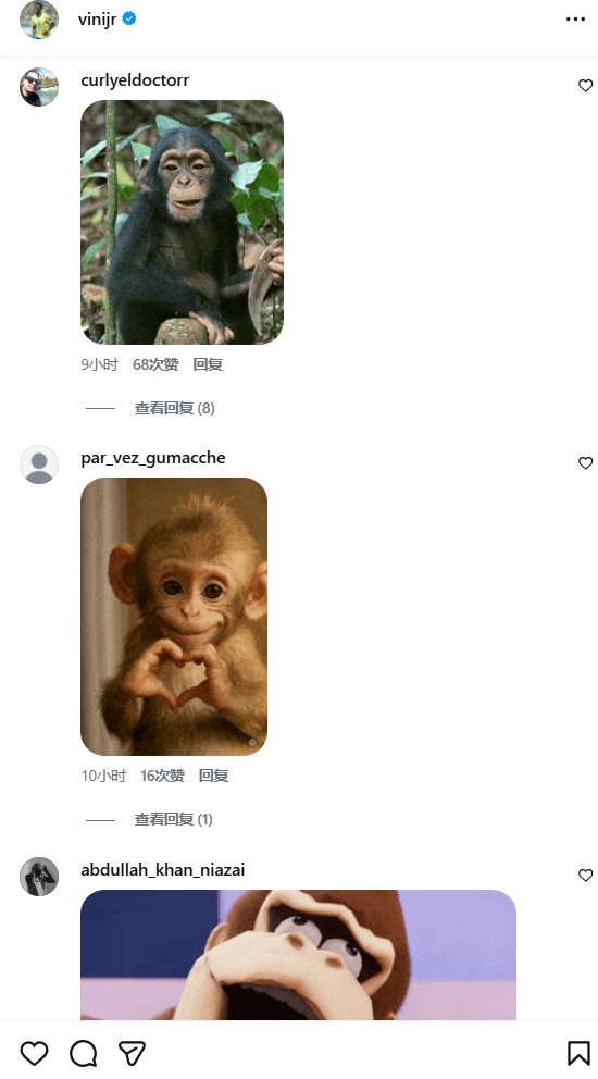 虽然不乏队友以及球迷的支持评论,但是评论区还是被球迷不和谐的评论攻占。很多球迷在评论区晒出猩猩、猴子的表情包嘲讽维尼修斯。