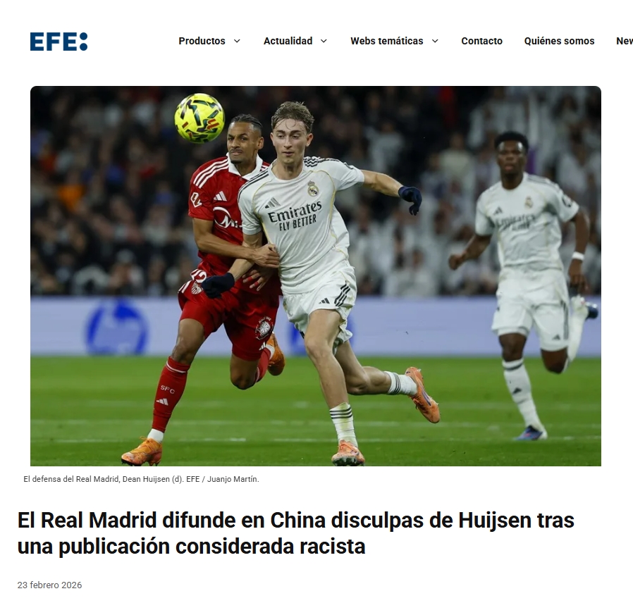 西班牙官方通讯社《埃菲社》发文报道了赫伊森转发辱华内容的事件,谈到了赫伊森“微博特供”版致歉以及皇马在2024年就曾卷入过类似的争议。阿斯报也援引了埃菲社报道。