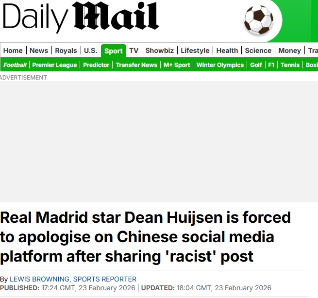 邮报报道赫伊森事件,表示皇马官方微博道歉,其余官方社媒均未提及。