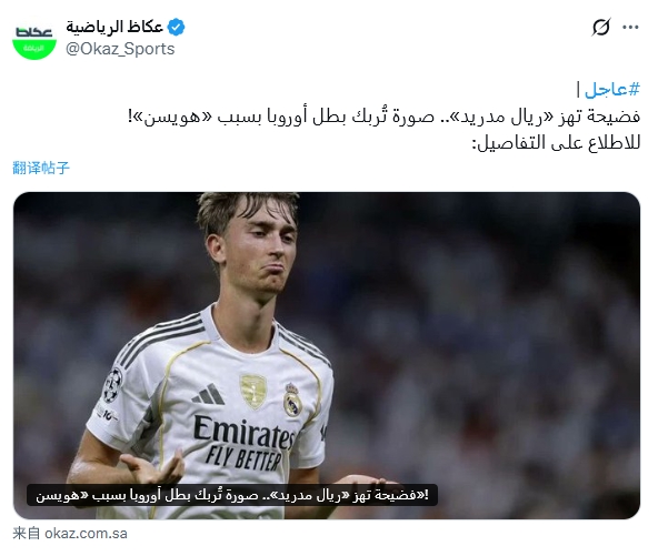沙特媒体okaz撰文报道赫伊森事件,表示皇马深陷丑闻,赫伊森让欧洲冠军陷入尴尬。