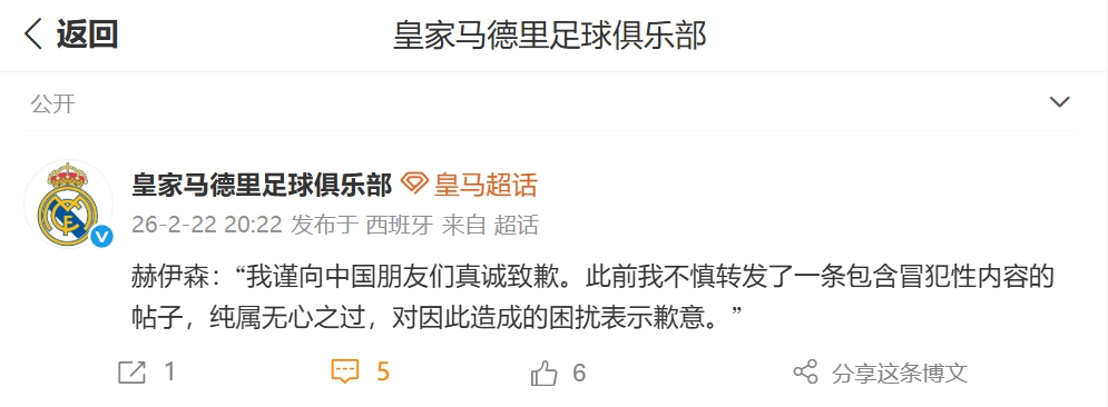 该事件迅速发酵,此后赫伊森将该转发内容删除。皇马官方微博发布赫伊森“特供版”道歉内容,被批没有诚意。