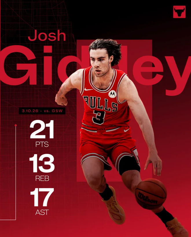 本场比赛,公牛球员约什-吉迪出战43分钟,16投7中,其中三分球9投4中,罚球4投3中,得到21分13篮板17助攻。