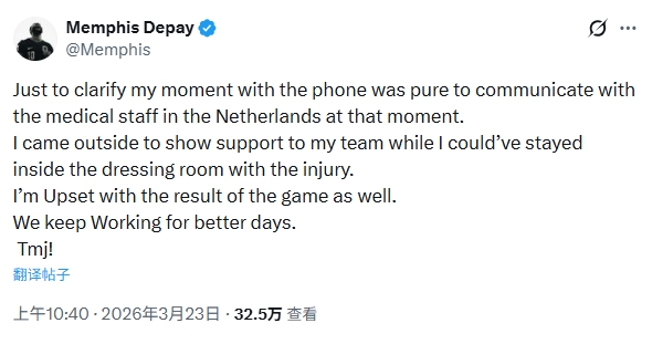赛后,德佩在社媒发文解释此事,他表示:“我需要澄清一下,当时我用手机纯粹是为了与荷兰的医疗团队沟通。虽然我因伤本可以留在更衣室,但我还是出来以示对我的球队的支持。我对比赛结果同样感到沮丧。我们会继续努力,期待更好的未来。”