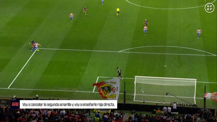 在西班牙足协公布的录音中,VAR裁判说:“我建议出示红牌,因为他阻止了一次明显的得分机会。”主裁布斯克茨·费雷尔表示:“接触点明显在禁区外,犯规很明显。是的,他当时是准备射门的。”VAR裁判继续分析:“在我看来,这名前锋始终控制着球,向球门方向移动,并且阻止了一次明显的得分机会,当时没有任何后卫能够上前封堵他。”主裁总结:“我完全同意。周围根本没有后卫,接下来的事大家都知道,会完成一次射门。我要取消第二张黄牌,直接给他一张红牌。”