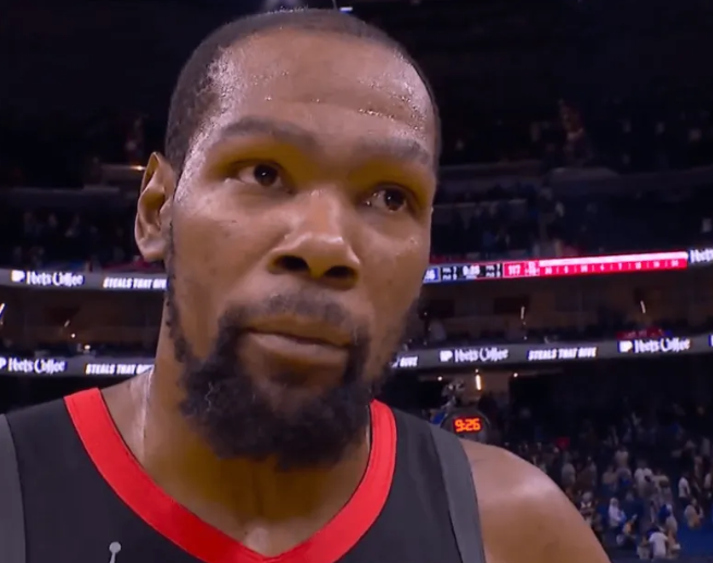 赛后,火箭球员凯文-杜兰特接受了场边记者的采访,并谈到了库里。