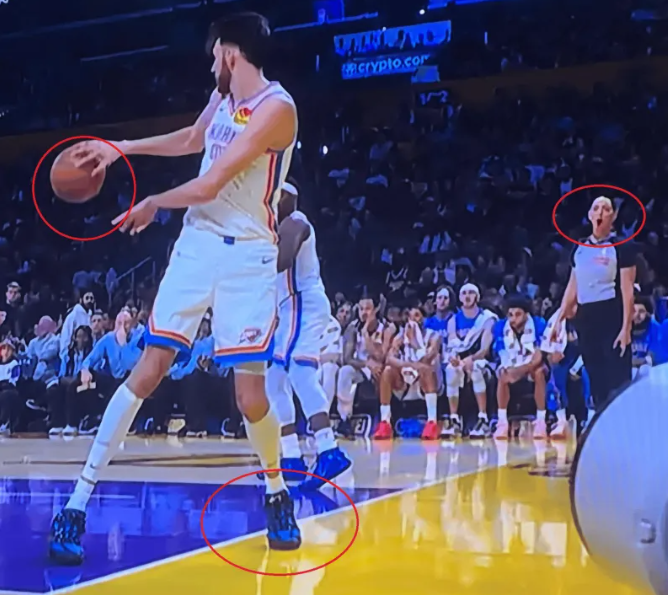 第二节比赛中,霍姆格伦踩到界外救球,裁判未吹罚雷霆出界球。