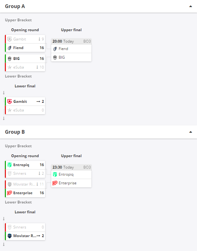 A组的BO1中,Gambit在揭幕战中不敌Fiend,保加利亚人在Dust2上利用良好的防守成功战胜对手挺进A组胜者组决赛。Fiend在胜者组的对手是战胜了eSuba的BIG,回到Mirage上的k1to就像回到了老家,带领德国战车一路平推赢下比赛。