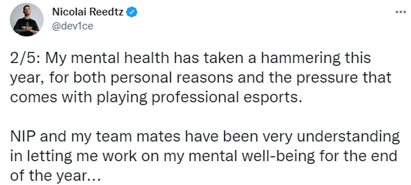 “由于个人原因和职业电子竞技带来的压力,我今年的心理健康出了大问题。NIP和我的队友们非常理解我,并让我在年末花时间去修复自己的心态问题。”
