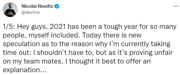“大家好,2021年对很多人来说都是艰难的一年,包括我自己。今天,关于我为什么这段时间休息又有新的猜测了。我本来不应该站出来说这些,但事实是这对我的队友不公平,我现在必须站出来给一些解释。”