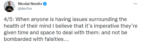 “当任何人的心理健康出现问题时,我觉得必须给他空间和时间来处理问题,而不是被虚假的流言轰炸。”
