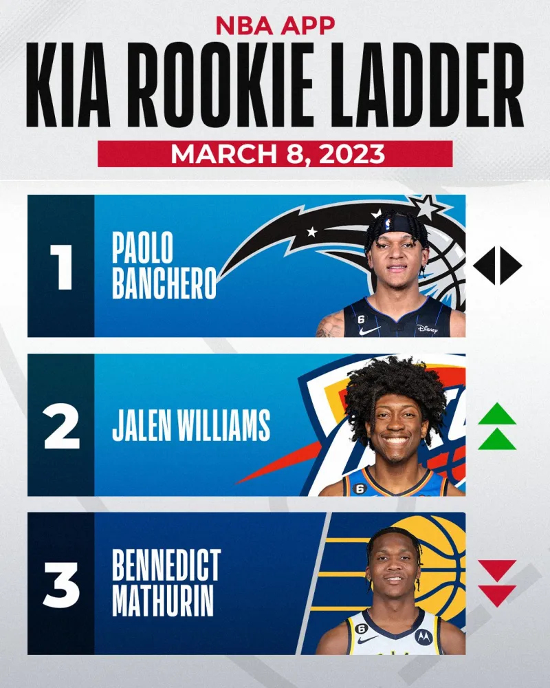 03月09日讯 NBA官方公布了最新一期的新秀榜,魔术球员保罗-班切罗继续领跑,雷霆球员杰伦-威廉姆斯升至第二,步行者球员本内迪克特-马瑟林占据第三。