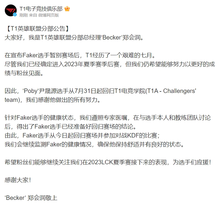 T1官方:Faker选手从今日起回归赛场并参加对战KDF的比赛