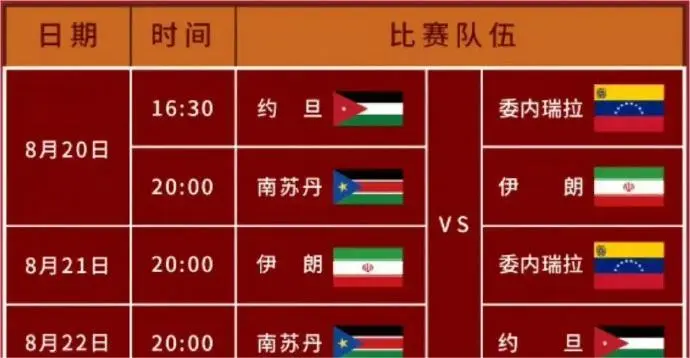 08月17日讯 据媒体人“球圈赵探长”消息,南苏丹、委内瑞拉、伊朗和约旦队将在福建晋江进行热身赛。