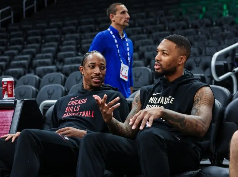 公牛官推晒出赛前,利拉德与拉文和德罗赞交流的照片。