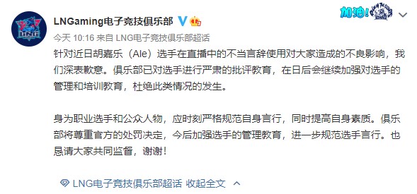 LPL快讯:Ale怒斥RNG粉丝为“皇军”,LNG俱乐部就此微博道歉