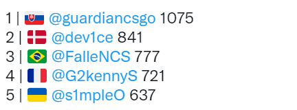 GuardiaN、dev1ce、FalleN、kennyS与s1mple成功进入该榜单的Top 5。斯洛伐克传奇狙击手Guardian以1075个击杀的恐怖数据领跑数据榜单,就算是排名第二位的dev1ce也与他有着较大差距。