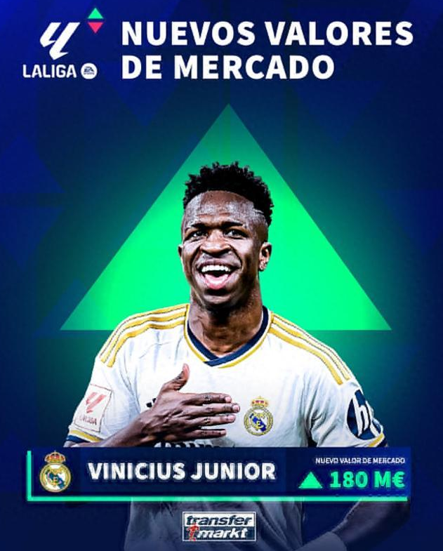 06月07日讯 德转今日更新西甲身价,维尼修斯最新德转身价为1.8亿欧,比肩姆巴佩、哈兰德、贝林厄姆,成为第4个1.8亿先生。