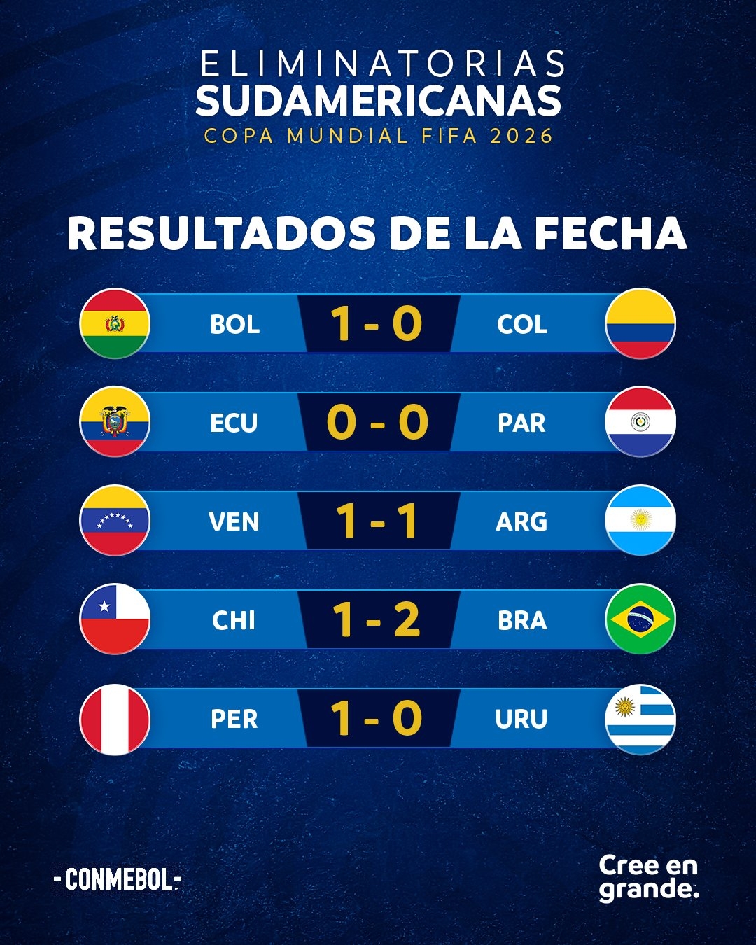 本轮比赛,南美区前4名一个没赢,巴西靠着绝杀第9的智利(现在已经垫底),反超打平的厄瓜多尔,升至第4。第一的阿根廷打平委内瑞拉,第二的哥伦比亚0-1不敌玻利维亚。