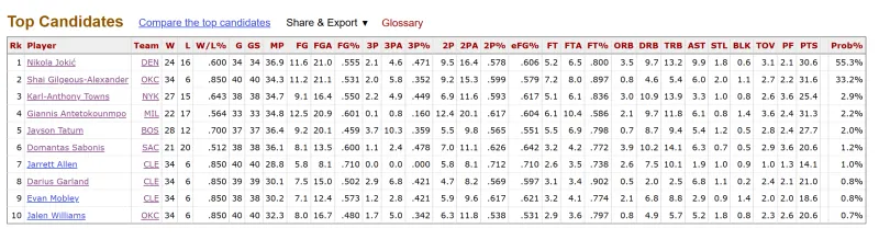 BBR的MVP实时概率榜:约基奇降至55%,亚历山大升至33%