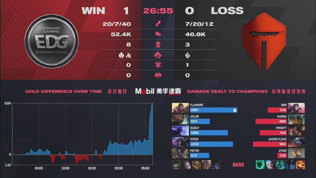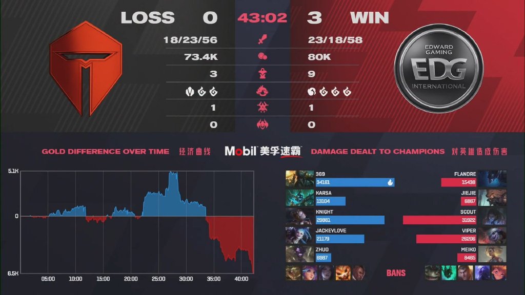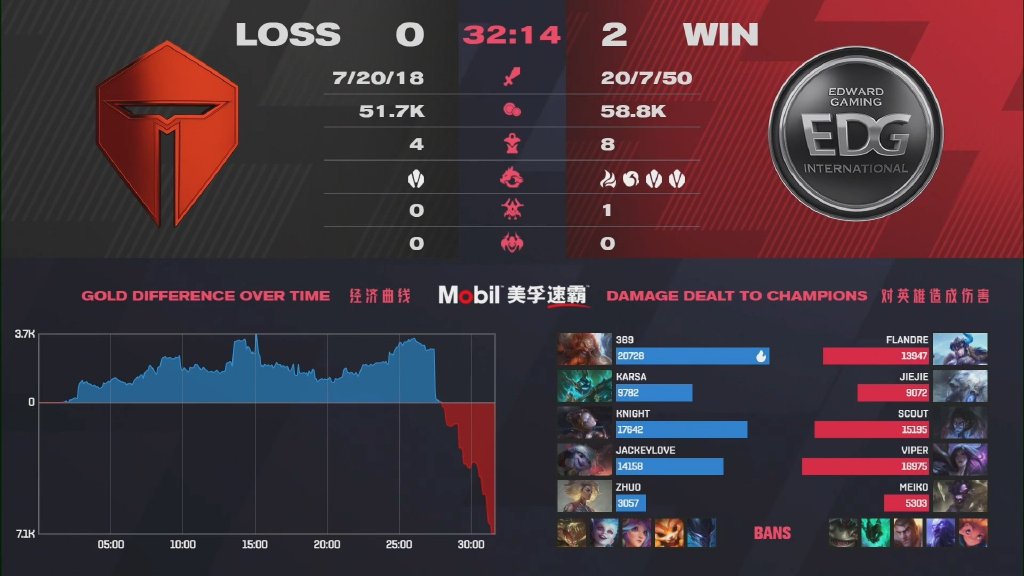 开局TES围绕上路打出一些小优势,然而瑞兹连续地游走帮助EDG中下都打开局面,而杰斯相对发育没有受到太大影响,中期TES完全无法处理成型的EDG双C,最终EDG中期连续发力早早终结比赛。